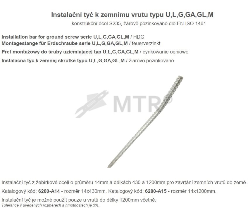 Montážní tyč k zemním vrutům - instalační tyč z žebírkové oceli (roxor) o průměru 14mm a délkách 430mm a 1000mm pro zavrtání zemních vrutů do země. Instalační tyč je možné použít pouze u vrutů do délky 1200mm včetně.